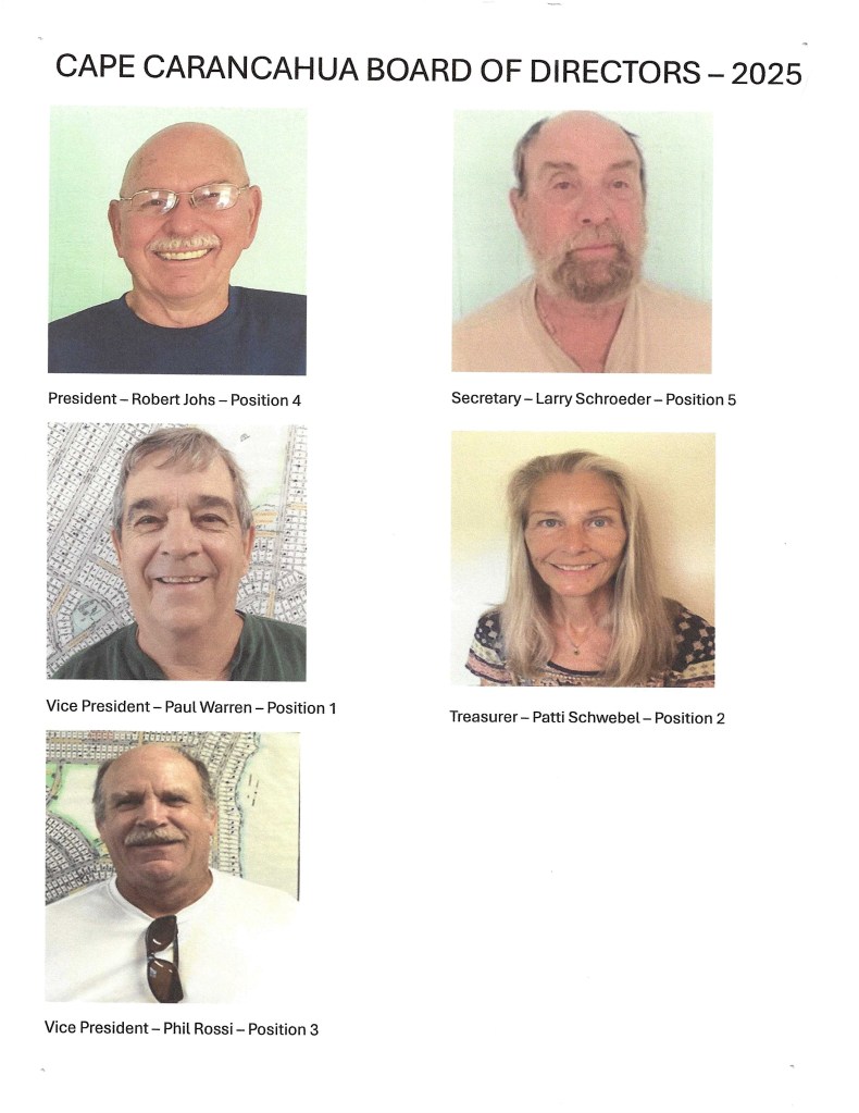 Business of the Cape is handled by a five-member Board of Directors, a competent maintenance staff, and on-site office at 2903 West Bayshore Drive